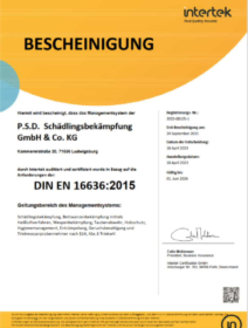 • Die Zertifizierung nach DIN EN 16636 ist ein zusätzliches Bewertungskriterium bei der Auswahl eines geeigneten Schädlingsbekämpfers. Entsprechende Audits für Schädlingsbekämpfer haben eine Dauer von mind. einemTag und sorgen